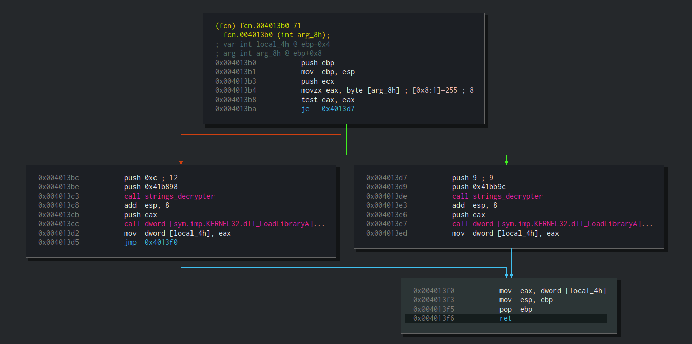 Next, we can see that the output of strings_decrypter (eax) is being pushed to another function at 0x4013b0 in addition to another argument, 1. Let’s have a look at this function: