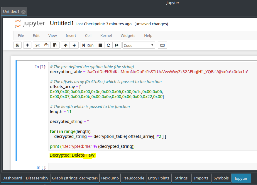 This is where another great feature of Cutter is being used, an integrated Jupyter notebook. We don’t need to open any external Python shell, we can use Cutter’s Jupyter widget.