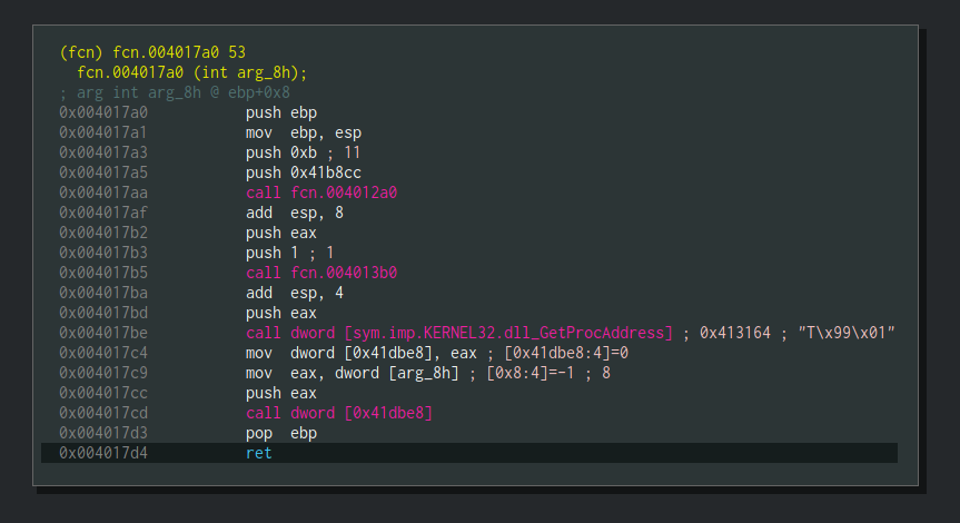 While I was going through Dropshot code, I found that it is using a rather not-too-complicated method to decrypt its embedded strings (well, most of them). This function stood up in my analysis mainly because it was called many many times in the code and was used mainly before LoadLibraryA and GetProcAddress. So it looked to me as a technique to load libraries and functions dynamically in order to complicate analysis. A very popular approach among malware authors. The aim of this article is not to understand every component of the malware, but to get familiar with Cutter, scripting with radare2, and how both can be used by malware researchers. Thus, (sadly) I won’t explain every step I took to find the decryption function.