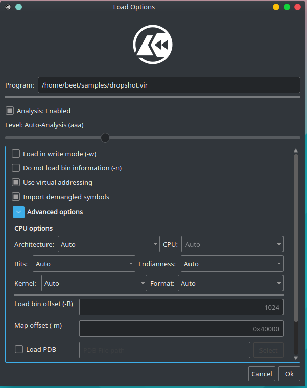 Now that we have Cutter installed, we are set to go and start our analysis. Open Cutter by double-clicking on its Icon or typing ./Cutter in the command line. Under the “Open File” tab select a new file and press “open”. After opening the file, we landed on the “Load Options” window of Cutter. This is an intuitive dialog where we can tell radare2 how to analyze the file. By expanding the “Advanced options”, we can set a specific Architecture, a CPU, choose a file format and many more.