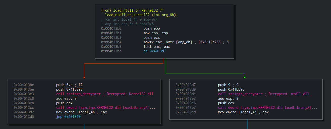 The function is taking the right branch if the argument passed to it is 0 (i.e EAX == 0) and the left branch if it is not. Either way, it will call LoadLibraryA with a string that would be decrypted using our beloved decryption function. I’ll spoil it for you — the function would load ntdll.dll on the right branch and kernel32.dll on the left. Simply put, the function is loading the required library in order to use a function from it. I’ll rename this function to load_ntdll_or_kernel32. Now let’s get back to the previous function and continue to examine it.