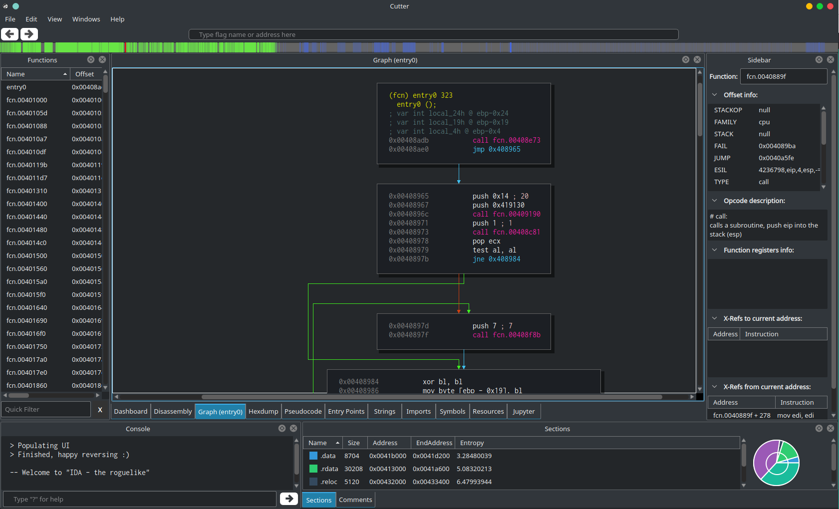 Along the years, the radare2 community had tried to develop many different graphic-interfaces for radare2. None of them came even close to Cutter. Cutter is a QT C++ based GUI for radare2. In my opinion, it is the GUI that radare2 deserves. To quote from Cutter’s Github page:
