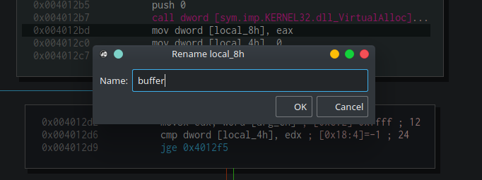 So, what do we have here? We obviously won’t go over it step by step, but we need to, and will, understand the general idea. We already know that this function receives two arguments. The first one is an address and the second is a number. The address argument is held by a variable named arg_8h, the integer is stored at arg_ch. At the first block, starting at 0x4012a0, we can see that a buffer at the size of arg_ch+1 is allocated by VirtualAlloc. Then the address to the allocated buffer is assigned to local_8h. We can rename it to buffer by clicking on its name and pressing Shift+N. This can also be done using the right-click context menu.