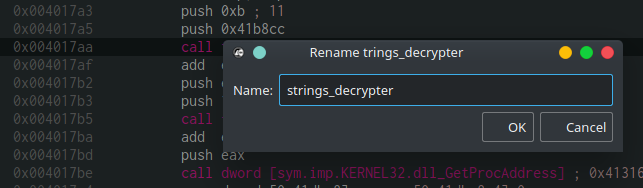 The demonstrated function above (0x4017a0) is passing two parameters into our decryption function (0x4012a0). The first argument is 0xb (Decimal: 11) and the second argument is an address at 0x41b8cc. This is the time to rename our strings decryption function in order to ease our analysis. It can be easily done by clicking on fcn.004012a0 and pressing Shift + N or by right-clicking and choosing “Rename fcn.004012a0“. Enter the new name and press OK. I chose to call it strings_decrypter.