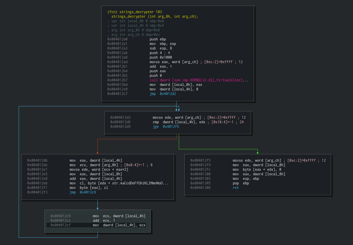 This array will help us later to write the decryption script. For now, let’s continue to figure out how strings_decrypter works. Entering the loop, we can see that eax will hold the index and ecx will hold the aforementioned array. Then, a byte from [ecx + eax*2] is moved to edx. Basically, edx now equals to half_word_array[index*2]. Next, our buffer is moved to eax which in turn is being added with the value of index, setting eax to a specific offset in the allocated buffer. Then, at 0x004012eb, we can see that a byte is moved to cl. This byte is taken from index [edx] of a pre-defined string. Double-clicking the string will reveal us the full string — AaCcdDeFfGhiKLlMmnNoOpPrRsSTtUuVvwWxyZz32.\EbgjHI _YQB:"/@\x0a\x0d\x1a. Immediately after that, the byte from cl is copied into the specific index in our buffer. The loop continues length times.