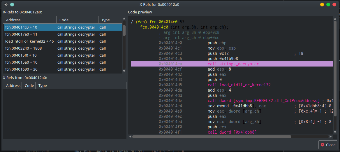 Now that we figured out how strings_decrypter is working, and even decrypted one string, we can see where else this function is being called and decrypt all the other strings. To see the cross-references to strings_decypter, click on its name and press X on the keyboard. This will open the xrefs window. Cutter will also show us a preview of each reference to this function which makes the task of inspecting xrefs much easier.