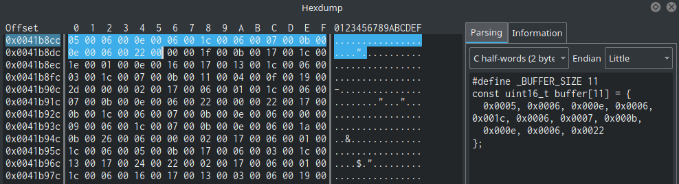 After that, we can see that zero is assigned to local_4h. The next block is a starting of a loop. We can see that the integer stored at arg_ch is assigned to edx which in turn is compared with local_4h. We can understand now that arg_ch is some kind of length or size and local_4h is a loop index. Let’s rename both to length and index. Now that we know the purpose of one argument of the two and the purpose of the two local variables, we need to understand what is in the address that is passed via arg_8h. In our example, we saw the value 0x41b8cc being passed to our strings_decrypter function. Let’s go to the Hexdump widget and seek to this address. Just type this address in the upper textbox in order to seek a flag or an address. We can see that this is a half-word (2 bytes) array of integers that starts from 0x41b8cc and ends at 0x0041b8e1. Using another great feature from Cutter (at the right side of the screen), we can generate a C array of half-words: